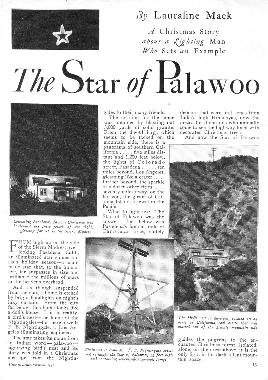The Star continued to shine around the Christmas Season for many years. It was featured in other publications, including an article in the “Electrical Dealer” magazine in November of 1930. Then on October 25 1935, a fast moving brush fire swept across the foothills above Altadena. It destroyed a trestle on the Incline Railway along with other parts of Echo Mountain . It also destroyed Nightingale’s wooden Star of Palawoo. Nightingale would not be deterred however, and rebuilt the Star. This time he made it with metal. The Star continued to shine around Christmas for quite some time but it’s unclear exactly how long.