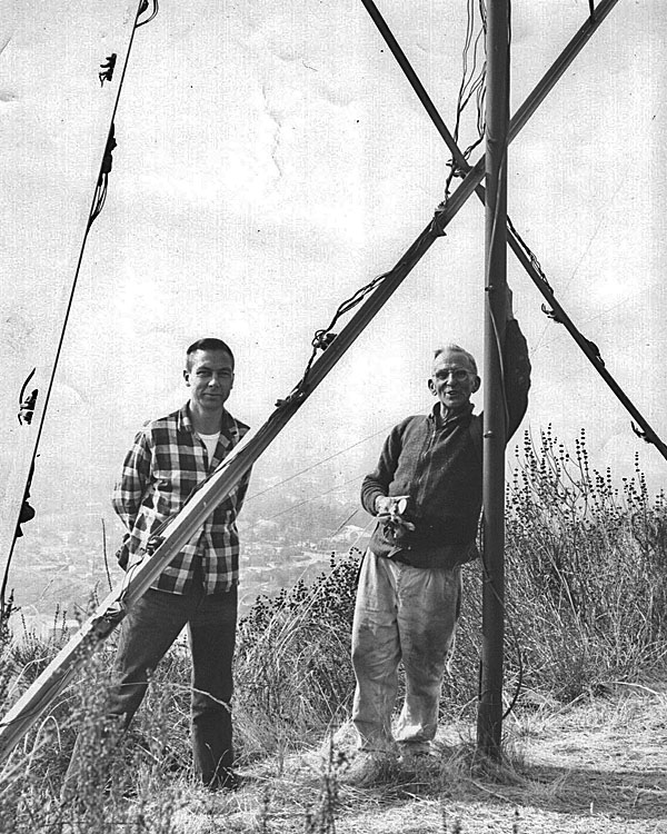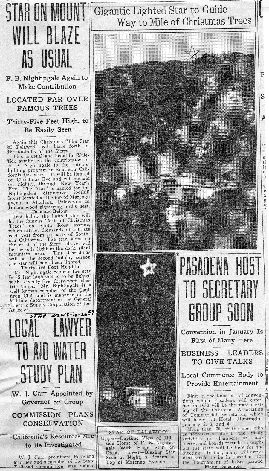 Nightingale erected the Star on a crest above his distinctive home located in the foothills above Altadena. His estate was called “Palawoo”, an Indian word for “Birds Nest”. The original Star was made from wood. It was 35 feet high and had 50 Forty-Watt light bulbs. The Star made it’s debut during the Christmas Season of 1928. The photos below show Nightingale working on the wooden star.