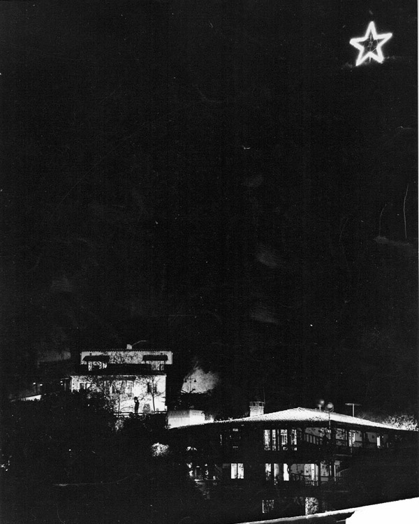 The Nightingale Estate was purchased by Dr. Elkins in 1989. He was unaware of the Star and had lived there a while before noticing the old broken wire running up the hill behind his house. Using binoculars, Dr. Elkins could see a pole up on the hill, hiked up to investigate and found the Star lying on the ground. He erected the Star again and rewired it using conventional outdoor Christmas lights. The Star of Palawoo would shine again.