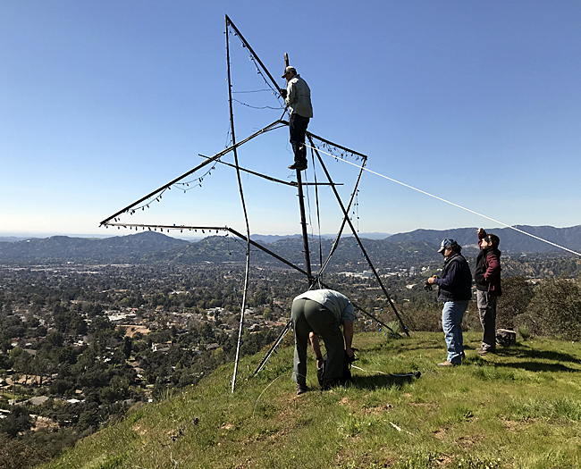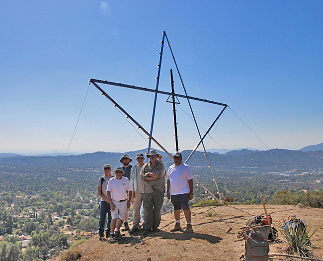 Volunteers scaled the steep hillside and removed the old Star from the mounting pole. Jeremiah Small climbs the support pole and releases the Star from the support pole. Dave Andrews, Lee Johnson and Joe Kaliel provide support from below. |