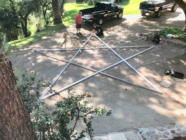 Dave Anderson and Joe Kaliel lay out the new metal on level ground. They measue, cut and drill the new metal and assemble the Star. Once assembled and checked they disassemble and wait for the big day. |