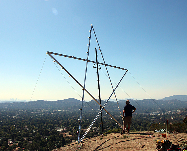 Nightingale erected the Star on a crest above his distinctive home located in the foothills above Altadena. His estate was called “Palawoo”, an Indian word for “Birds Nest”. The original Star was made from wood. It was 35 feet high and had 50 Forty-Watt light bulbs. The Star made it’s debut during the Christmas Season of 1928. The photos below show Nightingale working on the wooden star.